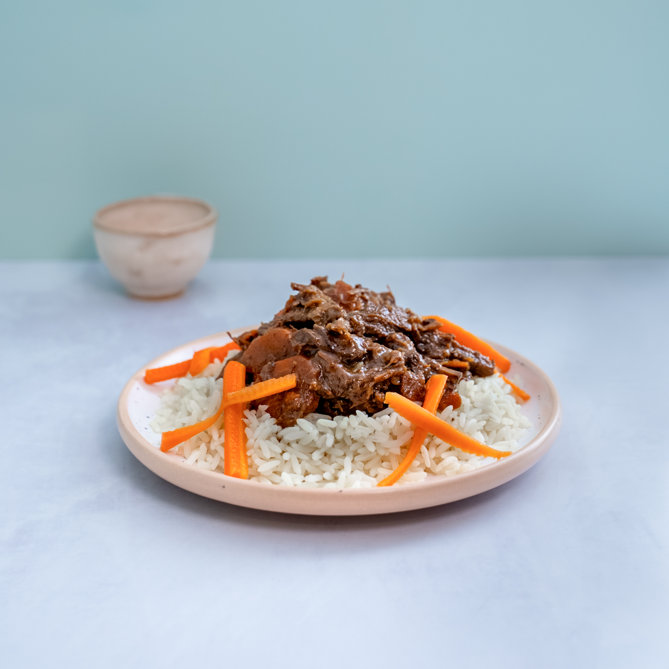 Cuadril cortada en cubos cocida en cacerola con cebolla y zanahoria rehogadas. Se cocina un largo rato para que la carne quede tierna pero no se desarme. Tiene jugos de la reduccion . Es una delicia