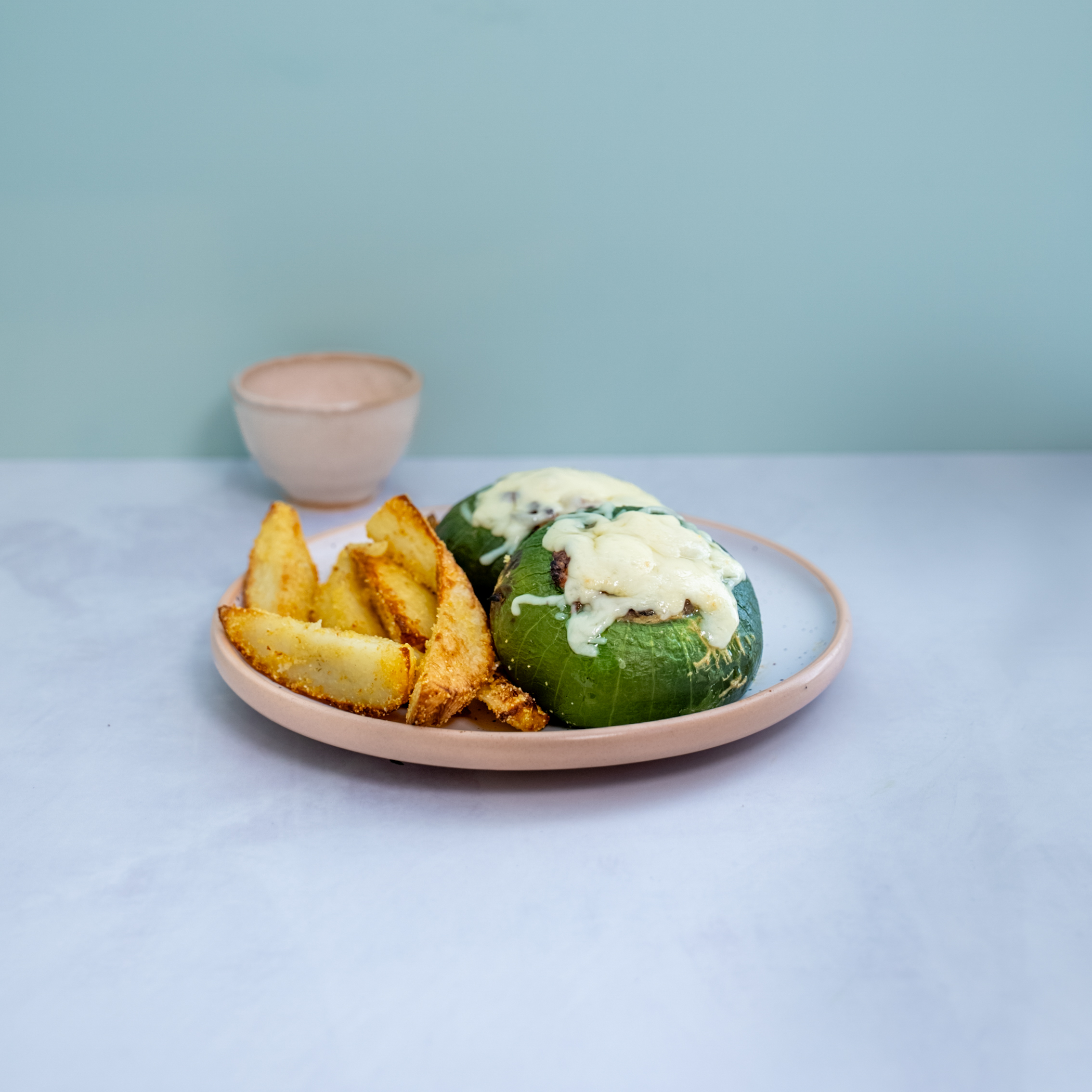 Zapallitos rellenos de vegetales y huevo con una fina capa de muzzarella por encima.
